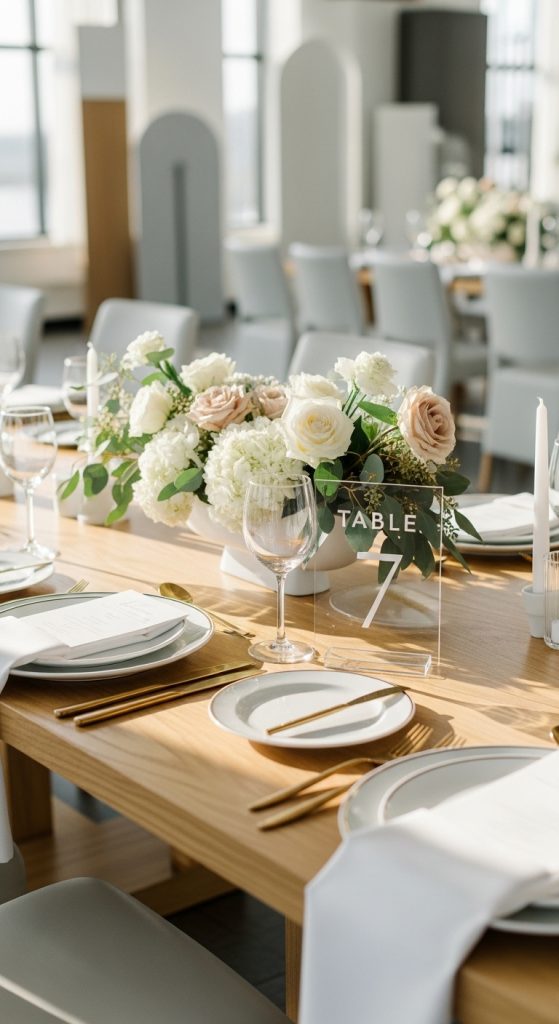 Glass panels etched with table numbers combine decor and organization. Use clear acrylic or glass sheets mounted on stands. Etch or apply vinyl lettering for numbering. Position near centerpiece without blocking visibility. The transparency integrates smoothly into table styling. This idea supports modern minimalist aesthetic while improving guest navigation.