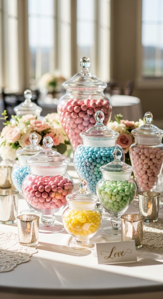 Large glass apothecary jars filled with candies or florals serve as decorative table accents. Choose jars of varying heights for layered effect. Fill with coordinated color items. Seal lids securely. Position at dessert or guest tables for interactive display.