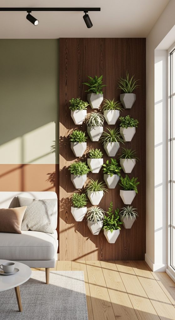 A mini indoor garden wall integrates greenery into apartment decor while maintaining organization. This idea uses vertical space to display plants in a structured and aesthetic manner.