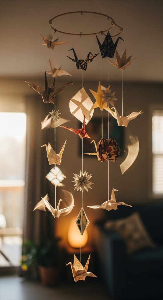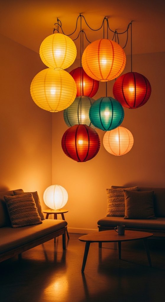 Hanging paper lanterns create a dynamic and layered ceiling design. This idea focuses on vertical decoration, making it ideal for apartments with limited floor space. The lanterns add color, texture, and movement to the room.