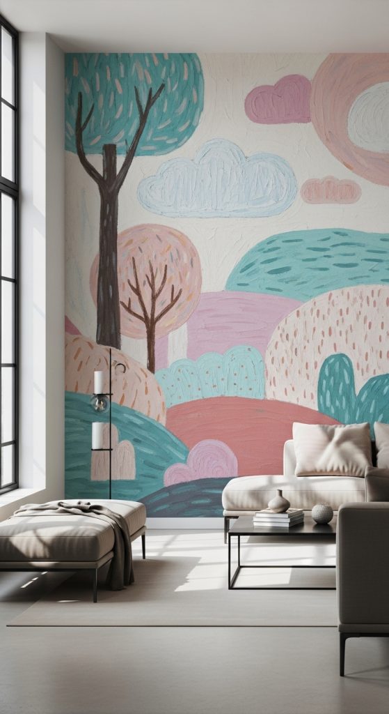 Storybook wall murals introduce imaginative visuals into apartment decor. This concept involves painting simple, illustrative scenes that create a whimsical environment. It allows personalization and creativity while maintaining a structured design approach.