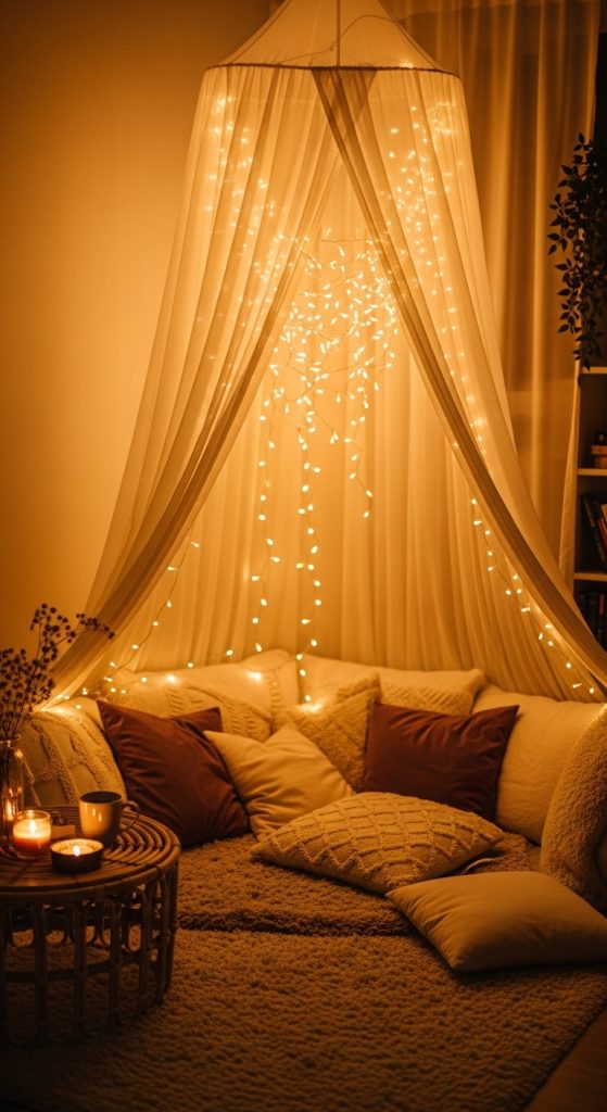 A fairy light canopy transforms a simple corner into a visually engaging and relaxing space. This idea uses lighting as a decorative element, creating depth and warmth in the room. It is particularly useful for small apartments where lighting can define different zones without physical partitions.