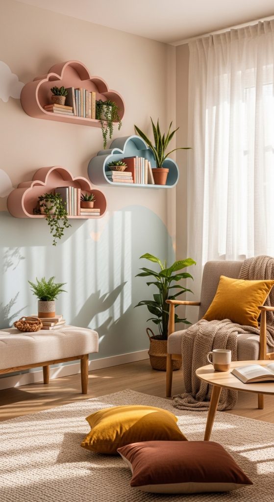 Floating cloud shelves combine storage with a soft, whimsical aesthetic. The concept involves designing shelves shaped like clouds to create a light and airy visual effect. These shelves work well in small apartments because they utilize vertical space while maintaining a decorative appearance. The design supports both functionality and creative expression, making it a strong example of modern home decor inspiration.