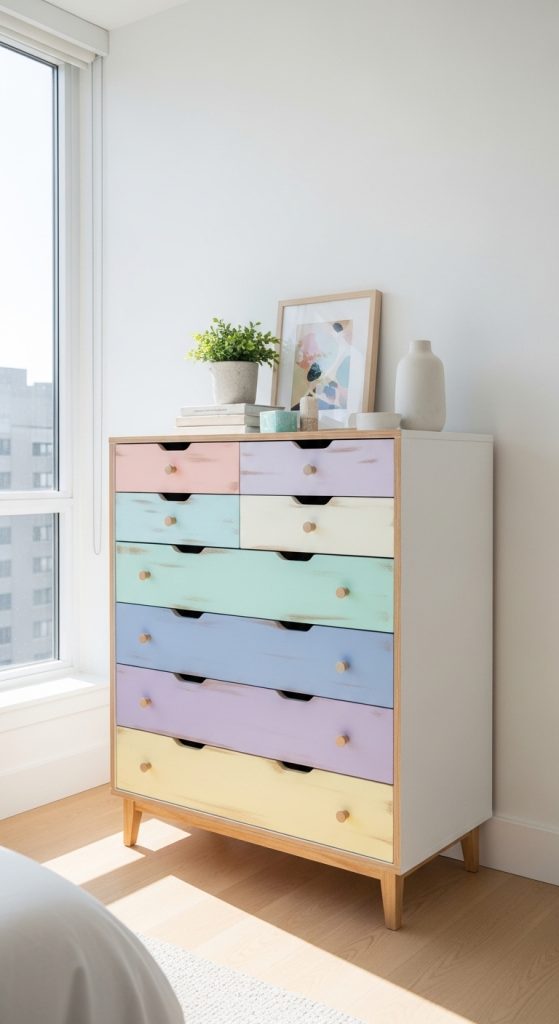 A colorful drawer makeover adds personality to furniture using simple painting techniques. This idea focuses on refreshing existing items instead of replacing them.