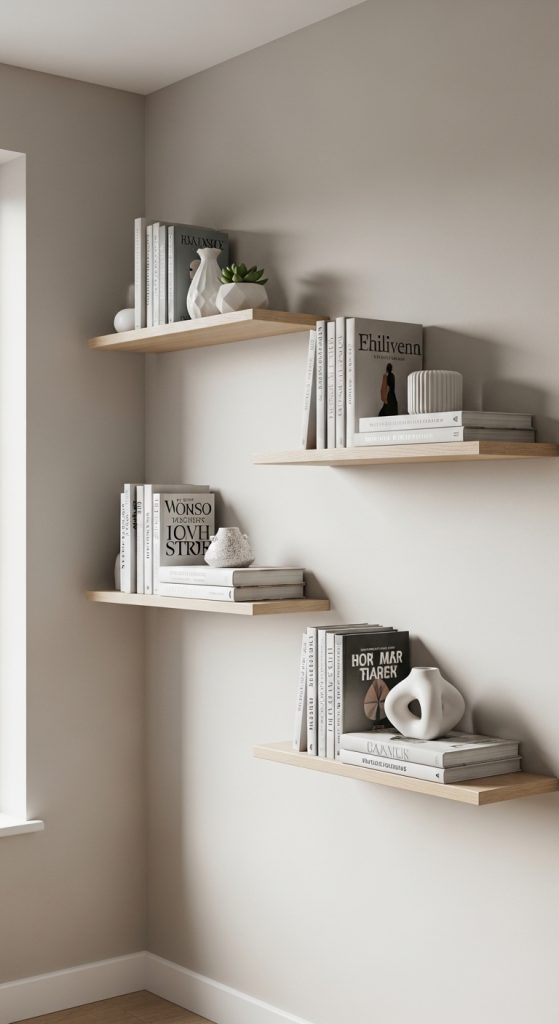 Install narrow shelves or hidden brackets on the wall. Arrange books with covers facing outward to create a visual display. Maintain consistent spacing to avoid clutter.