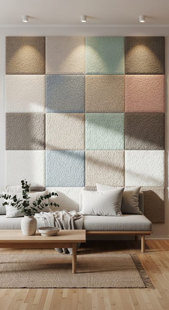 Fabric wall panels introduce texture and softness into the decor. This idea uses textiles to create a layered and cozy environment.