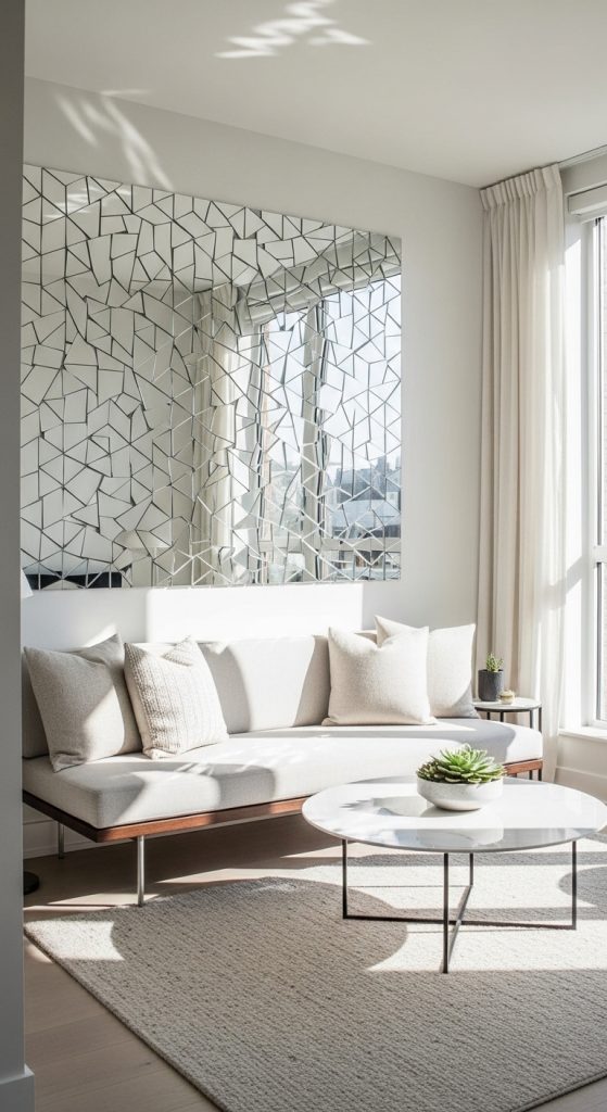 A decorative mirror mosaic enhances light reflection and creates an illusion of larger space. This idea combines functionality with artistic design.