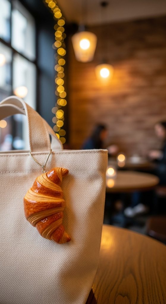 Food-inspired charms are incredibly popular, and a mini croissant gives off cozy café-core vibes. This design is slightly textured, making it look realistic and eye-catching. It’s perfect for tote bags, especially canvas or neutral-colored ones.