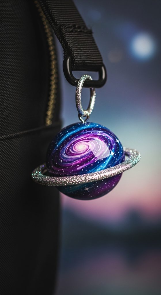 A tiny planet charm with rings gives off cosmic and dreamy vibes. It’s perfect for space lovers and aesthetic backpack styling.
