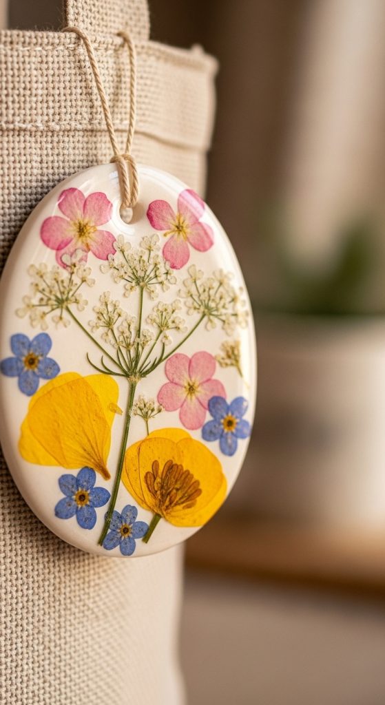 Pressed flower charms look delicate and artistic. You can embed dried flowers directly into the clay before it dries for a soft, romantic aesthetic.