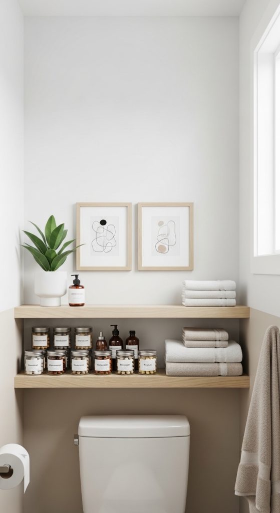 The space above the toilet is often unused. Add small shelves or stack crates to create decorative storage. Style with plants, jars, and framed art.