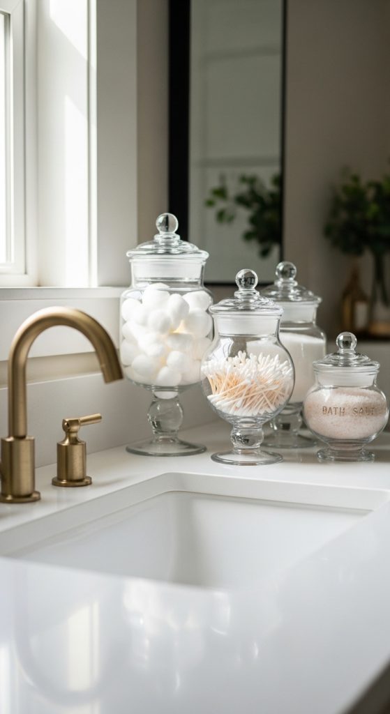 These canisters are perfect for cotton rounds, bath salts, floss picks, hair ties, or makeup sponges. The key to making them look cohesive is consistency—choose a color theme or finish that matches your bathroom decor. Spray paint lids for a modern monochrome look, or add wooden knobs for a rustic farmhouse feel.
