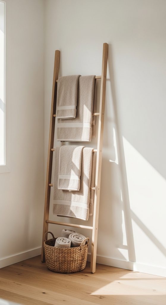 A towel ladder adds charm and functionality. Instead of buying an expensive one, you can create a decorative version using Dollar Tree supplies combined with inexpensive wooden dowels. It provides a stylish way to display towels while enhancing vertical space.