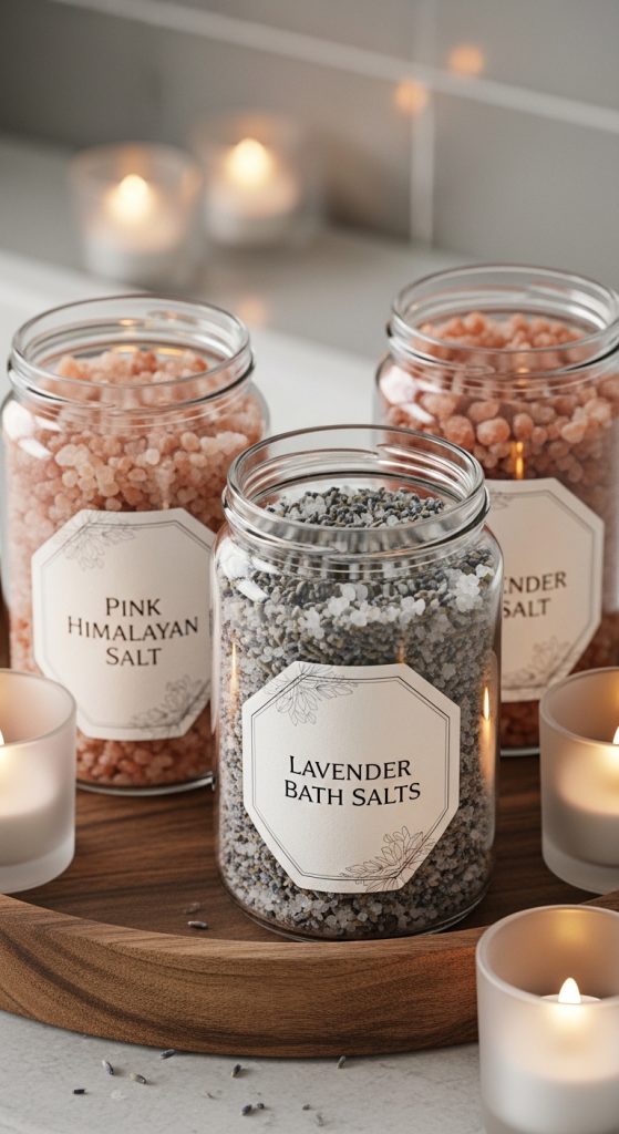 Choose clear jars so the bath salts become part of the decor. You can add essential oils and dried lavender for scent and aesthetic appeal. Label each jar with calming names like “Relax,” “Unwind,” or “Detox.”
