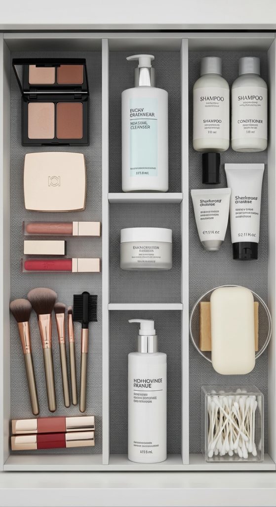 Cluttered drawers can make your bathroom feel chaotic. Create custom drawer dividers using Dollar Tree organizers to keep makeup, toiletries, and grooming tools neatly separated.
