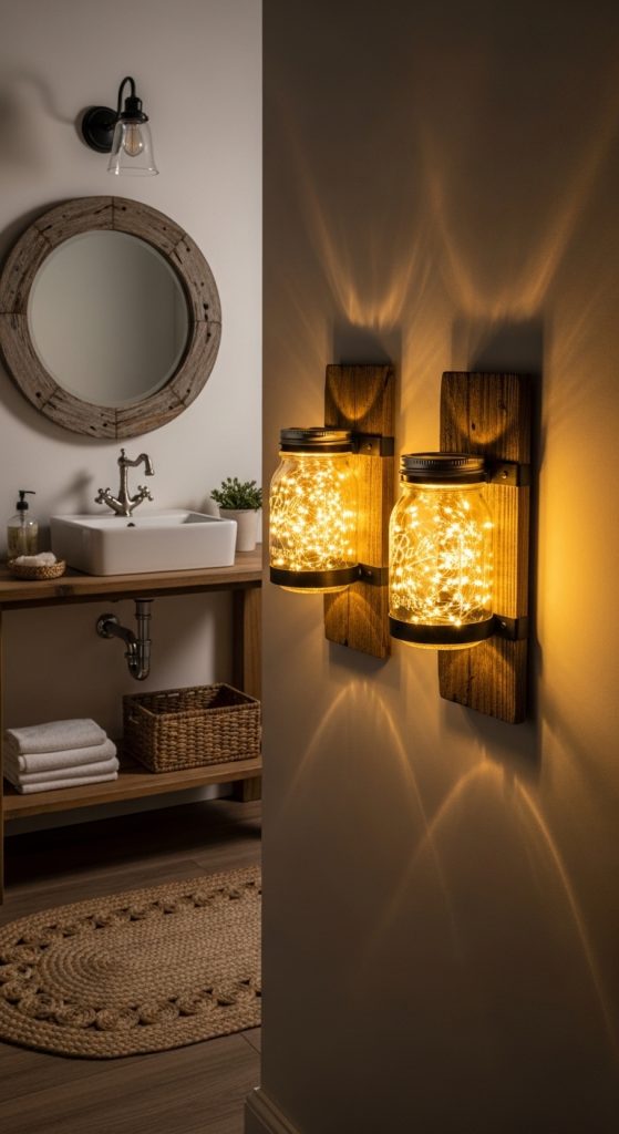 Add soft lighting and charm with mason jar wall sconces made from Dollar Tree jars. These decorative pieces add warmth and character, especially in farmhouse-style bathrooms.