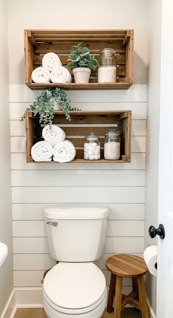 Floating shelves are perfect for small bathrooms where storage space is limited. Wooden crates from Dollar Tree can be transformed into rustic floating shelves that hold towels, plants, or decorative accents. They create vertical storage while keeping the floor clear, making your bathroom feel larger and more organized.