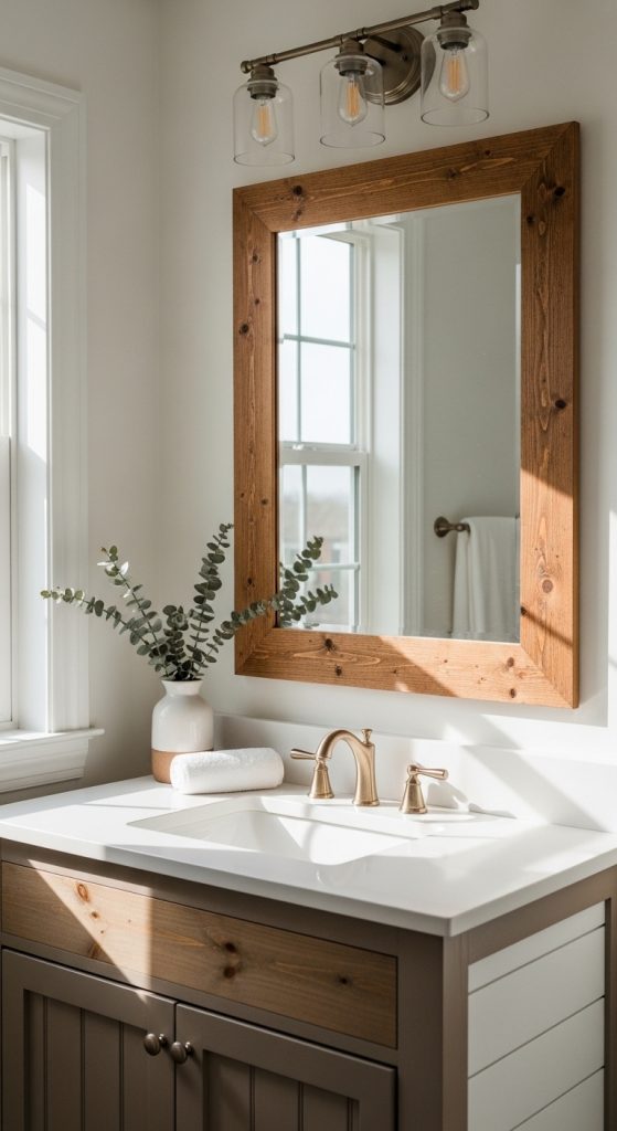 Framing your mirror adds depth and elegance. Choose wood-look trim for farmhouse style or sleek painted trim for a modern aesthetic. This project dramatically changes your bathroom without replacing the mirror entirely.