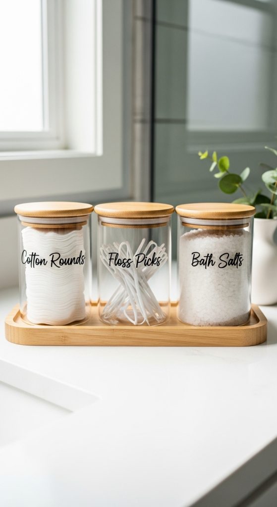 A matching canister set makes your bathroom look organized and thoughtfully styled. Instead of buying expensive ceramic sets, you can create a custom version using Dollar Tree glass jars, small containers, or storage tins.