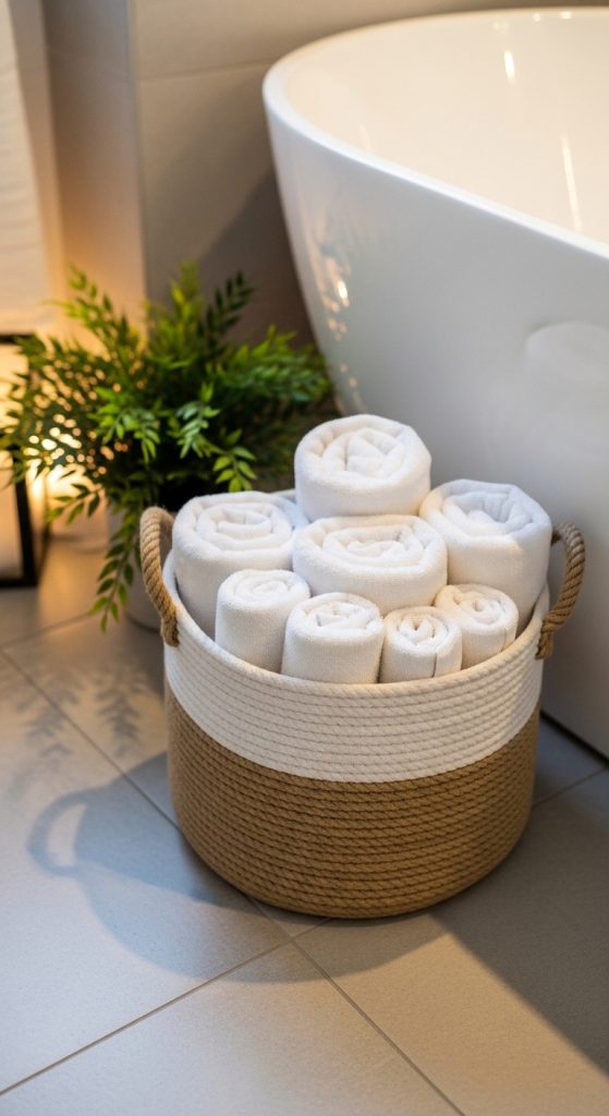This project is both functional and stylish. Stack small baskets vertically and secure them together to create a freestanding tower. You can paint them white for a clean modern look or wrap them in rope for a textured farmhouse vibe. Place the tower next to the toilet for easy access.