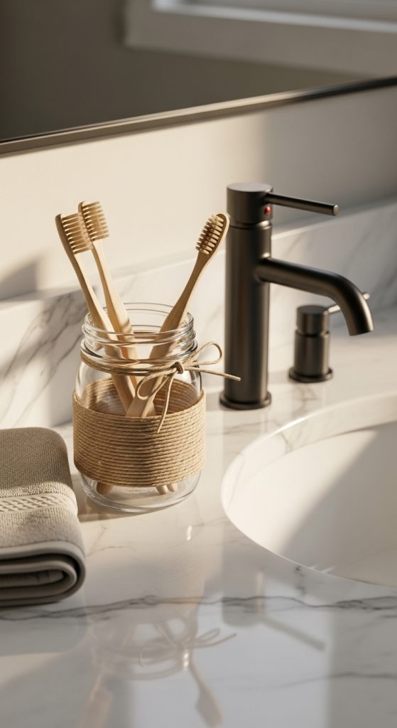 Plastic toothbrush holders can look cheap. Upgrade your bathroom instantly by using decorative glass jars instead. A simple mason jar from Dollar Tree can be transformed into a chic holder with twine, paint, or metallic accents.