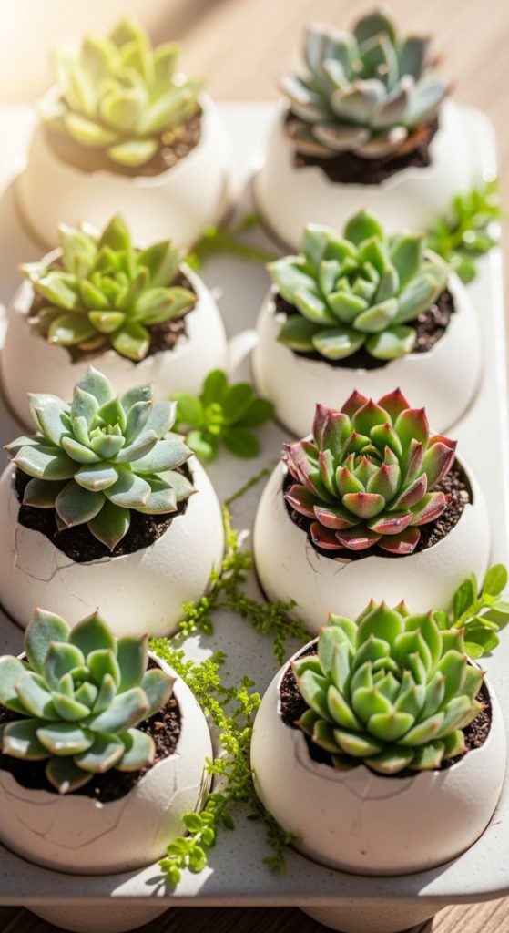 Carefully crack the top of raw eggs and empty contents. Rinse shells and let dry. Fill with small pebbles and potting soil. Plant tiny succulents inside. Mist lightly and display in decorative trays.