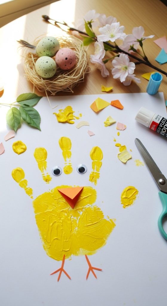 Handprint crafts are always a hit with kids because they turn their own hands into art. The handprint Easter chick is a sentimental and adorable keepsake craft that parents love to save. It captures a moment in time — especially meaningful for toddlers and preschoolers.