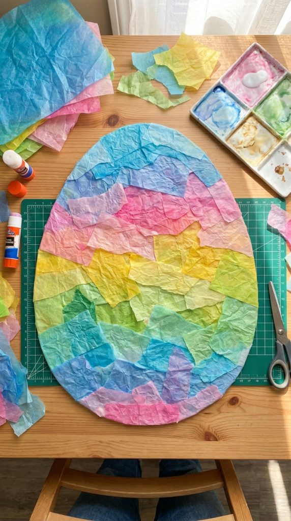 - Place small pieces of colorful tissue paper inside the egg shape.