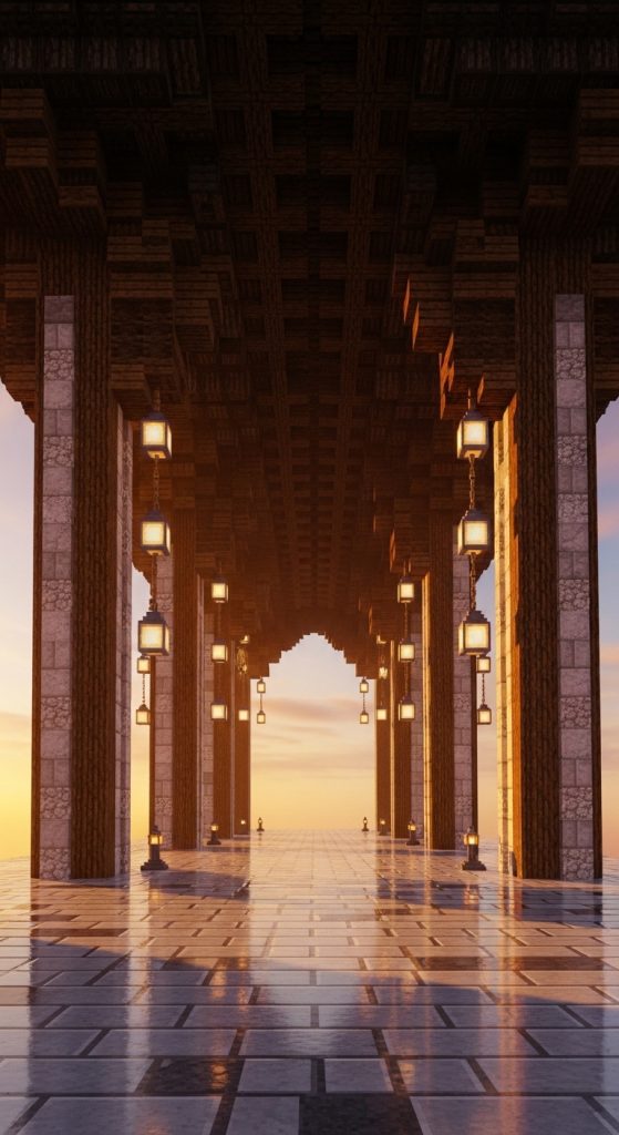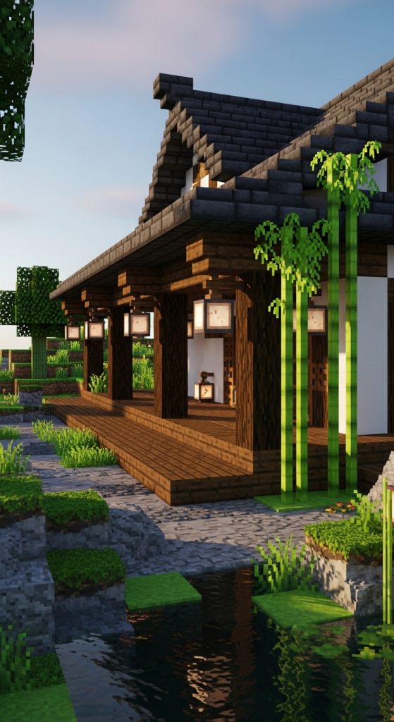 This design pairs beautifully with bamboo, dark oak, and white concrete walls. It’s ideal for zen gardens or peaceful survival builds.