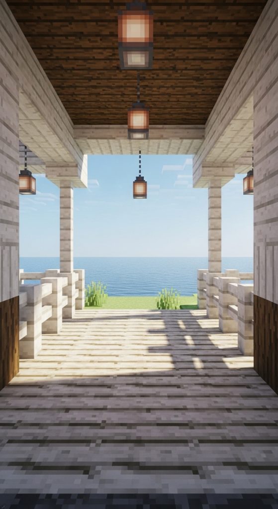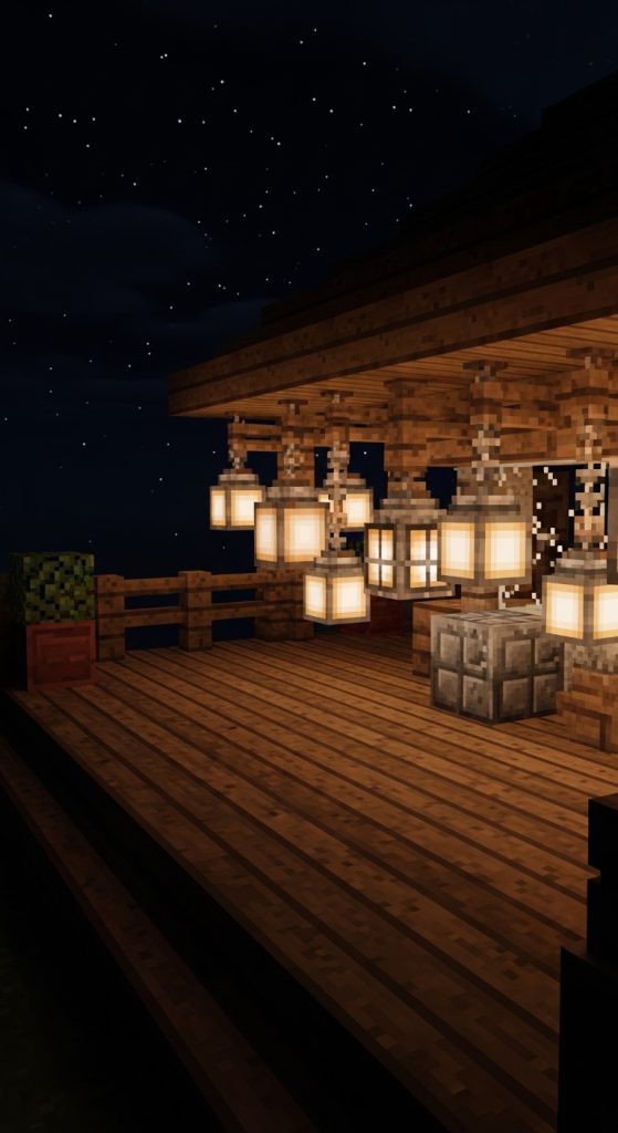 Porches also make survival gameplay more immersive. Imagine arriving home at night with mobs nearby — a warmly lit porch with lanterns feels safe and welcoming. Or picture a rainy biome where your covered entryway protects your door while adding cozy vibes. These subtle design improvements create a richer Minecraft experience.