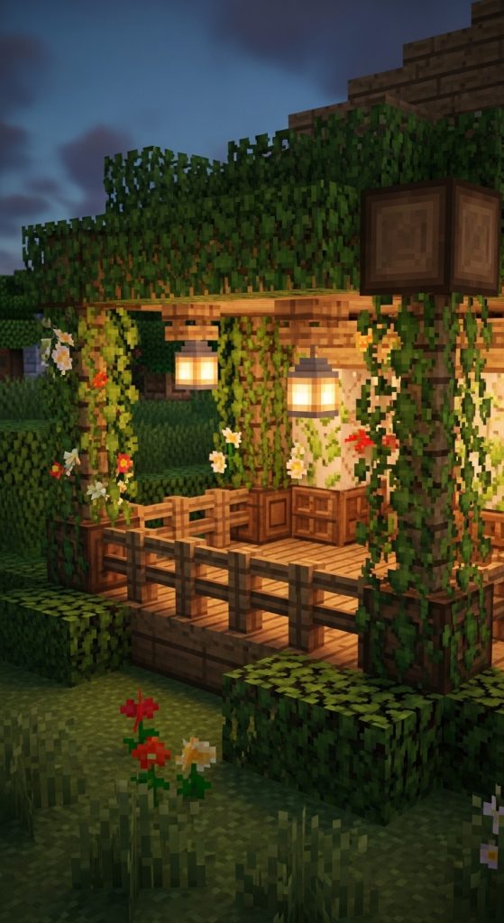 Cottagecore builds thrive on cozy covered porches with vines and lantern glow. This is perfect for flower forest biomes.