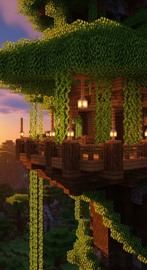 If you’re building high in jungle trees, your porch becomes more like a suspended balcony. A jungle treehouse porch feels adventurous and organic, blending with surrounding leaves and vines.